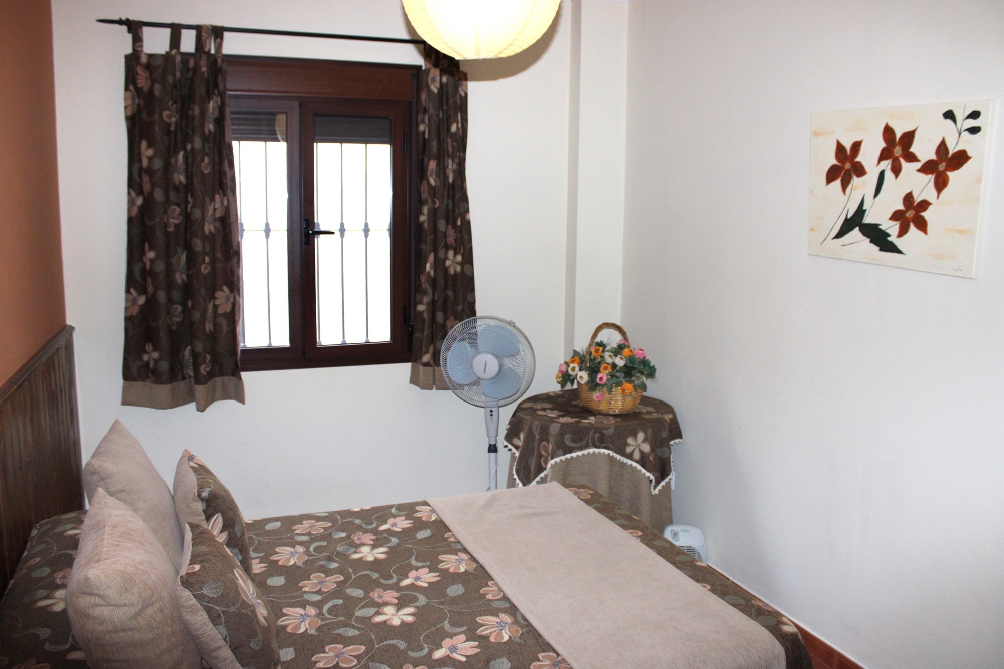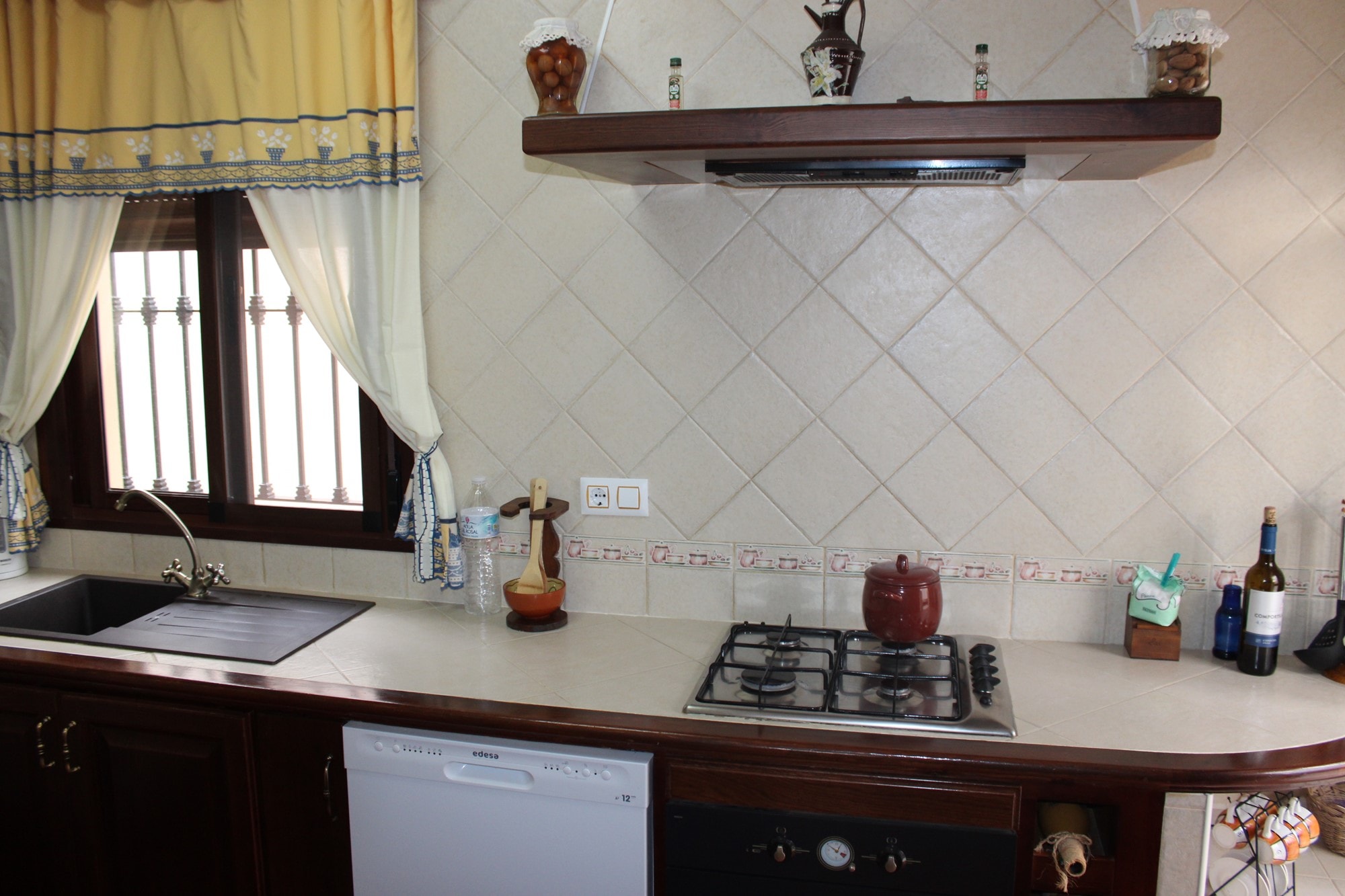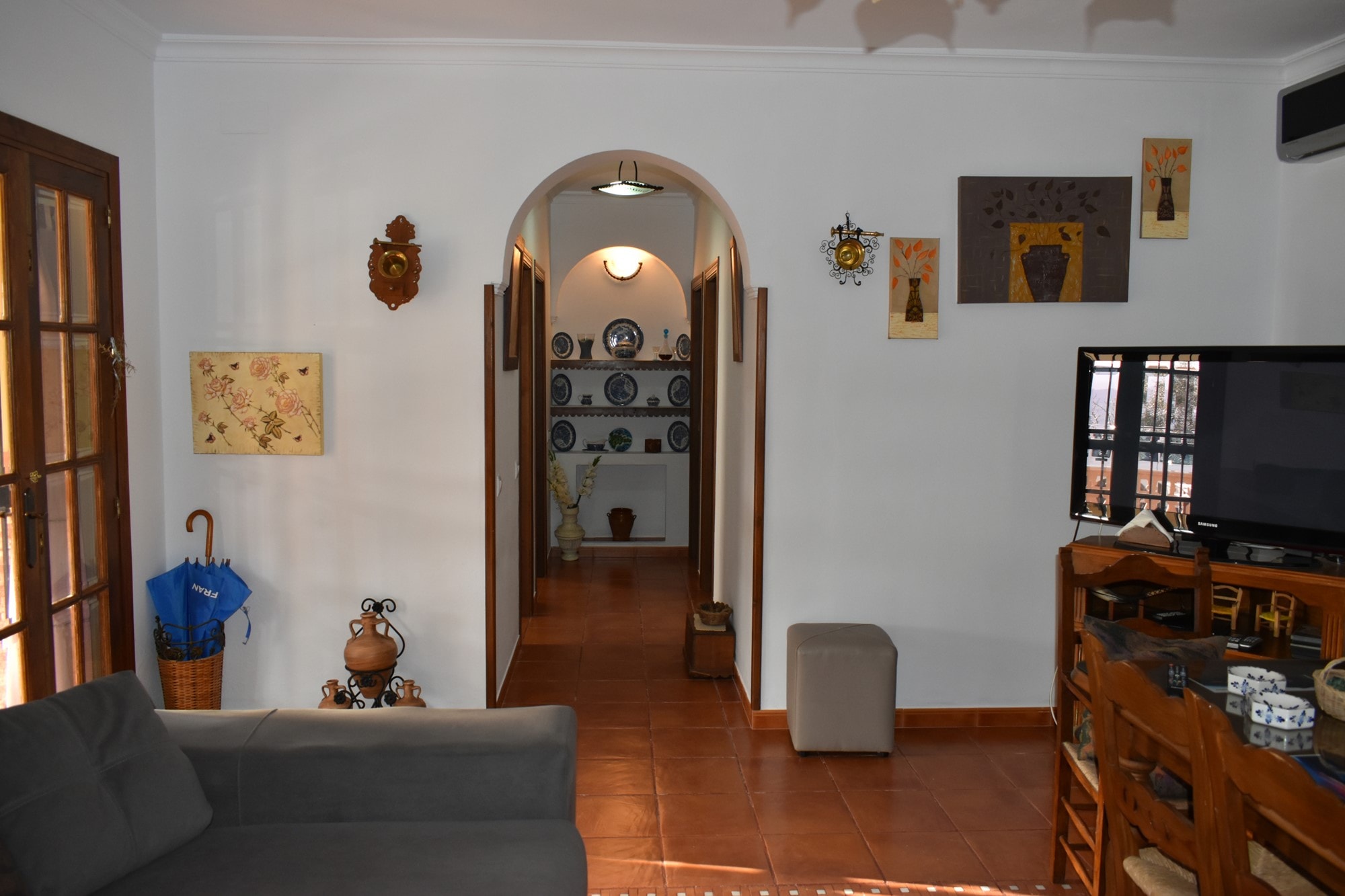 The traditional Spanish house welcomes you with a lounge equipped with a hot and cold air conditioning unit, a fireplace, and a kitchen separated by a beautiful arch passthrough window and doorway. A hallway leads to the bathroom and three bedrooms. The kitchen includes a small pantry.