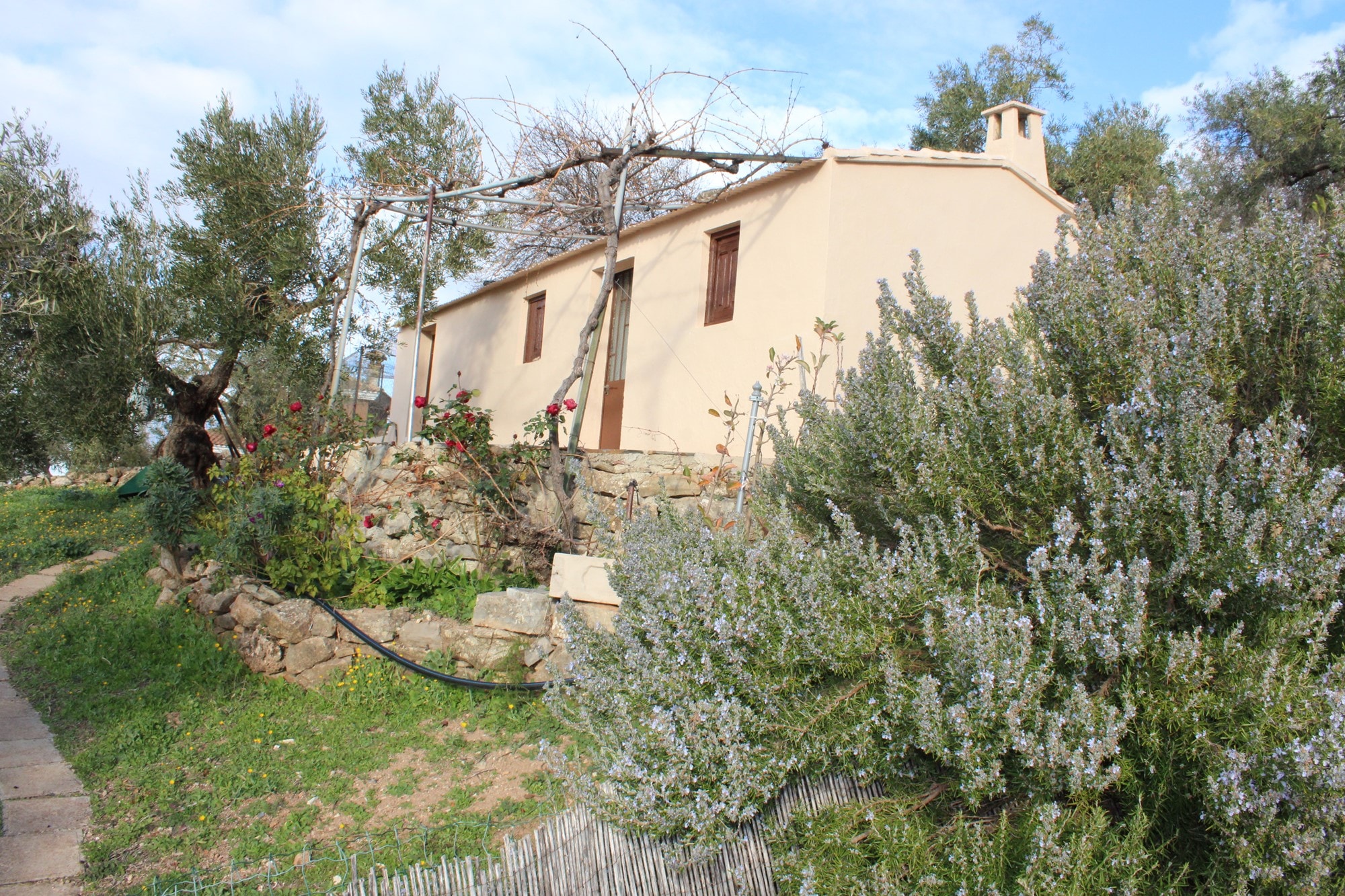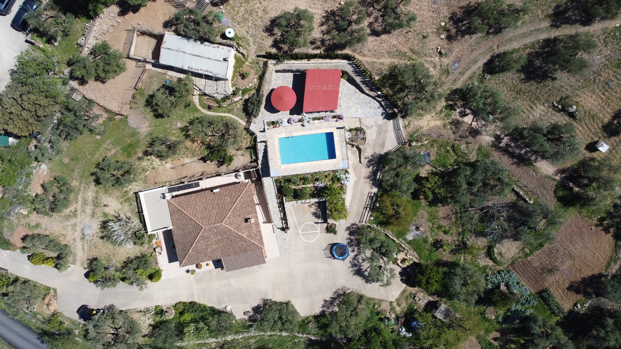 Nestled on a generous plot of approximately 20,000 square meters, the property features an olive grove and an array of fruit trees such as apricot, fig, quince, lemon, orange trees, and grape vines. The outdoor space boasts a captivating private swimming pool area and an al fresco dining area, providing a perfect vantage point to appreciate the surrounding mountains.