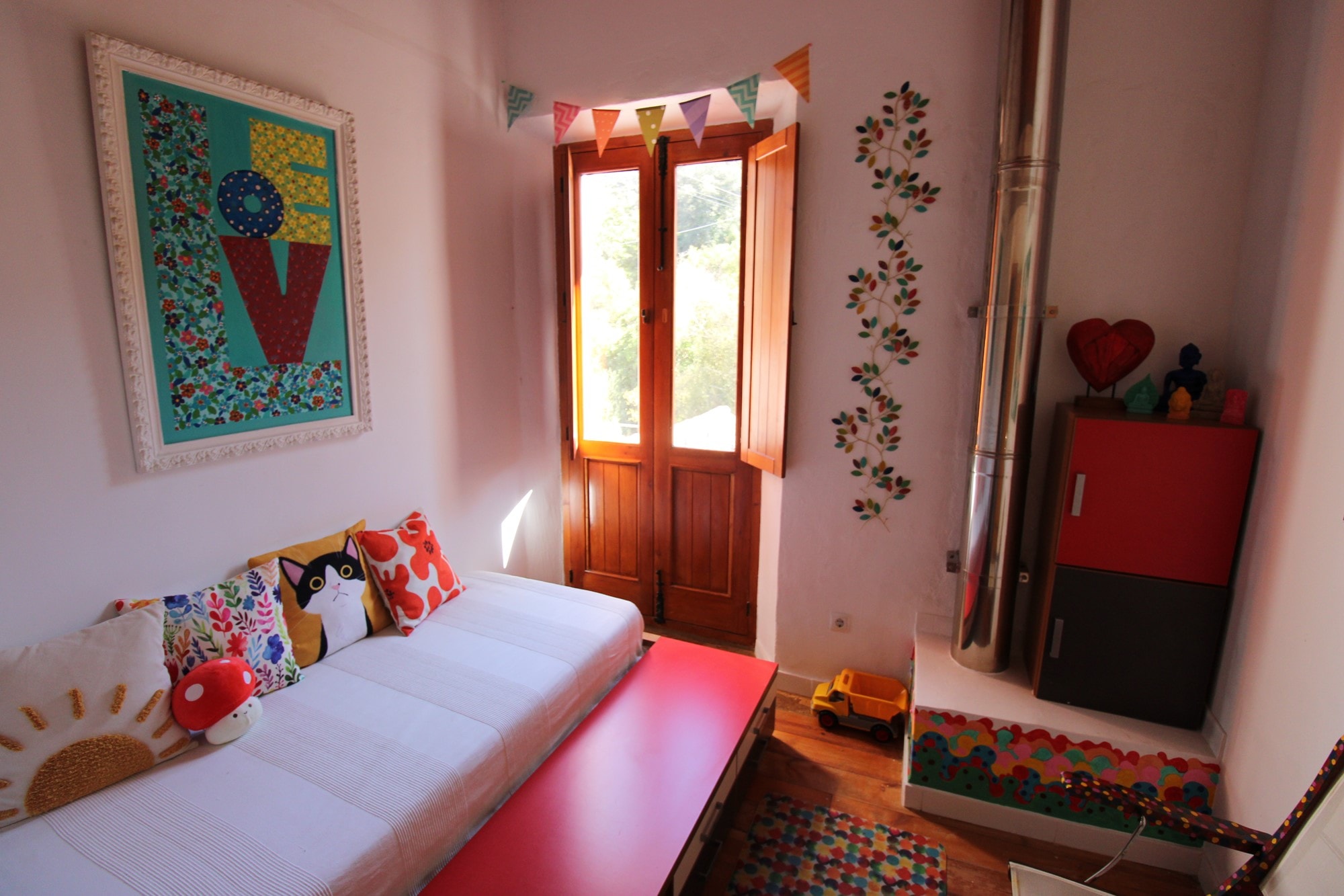 The heart of the home is a breathtaking kitchen, equipped with a wood-burning oven and hob that not only adds to the ambiance but also heats the house and the upstairs bedroom via cleverly designed heat-conducting pipes. A gas oven provides additional practicality for modern cooking needs.