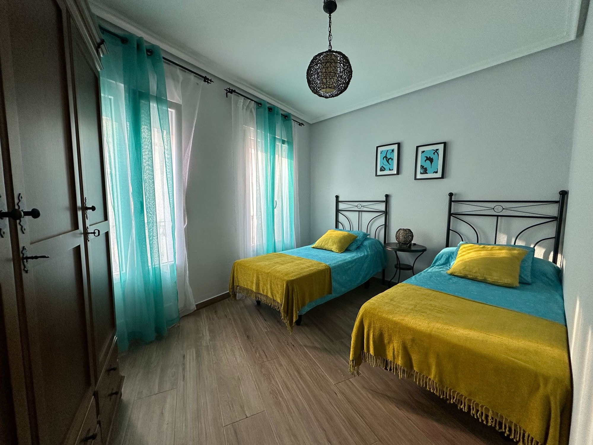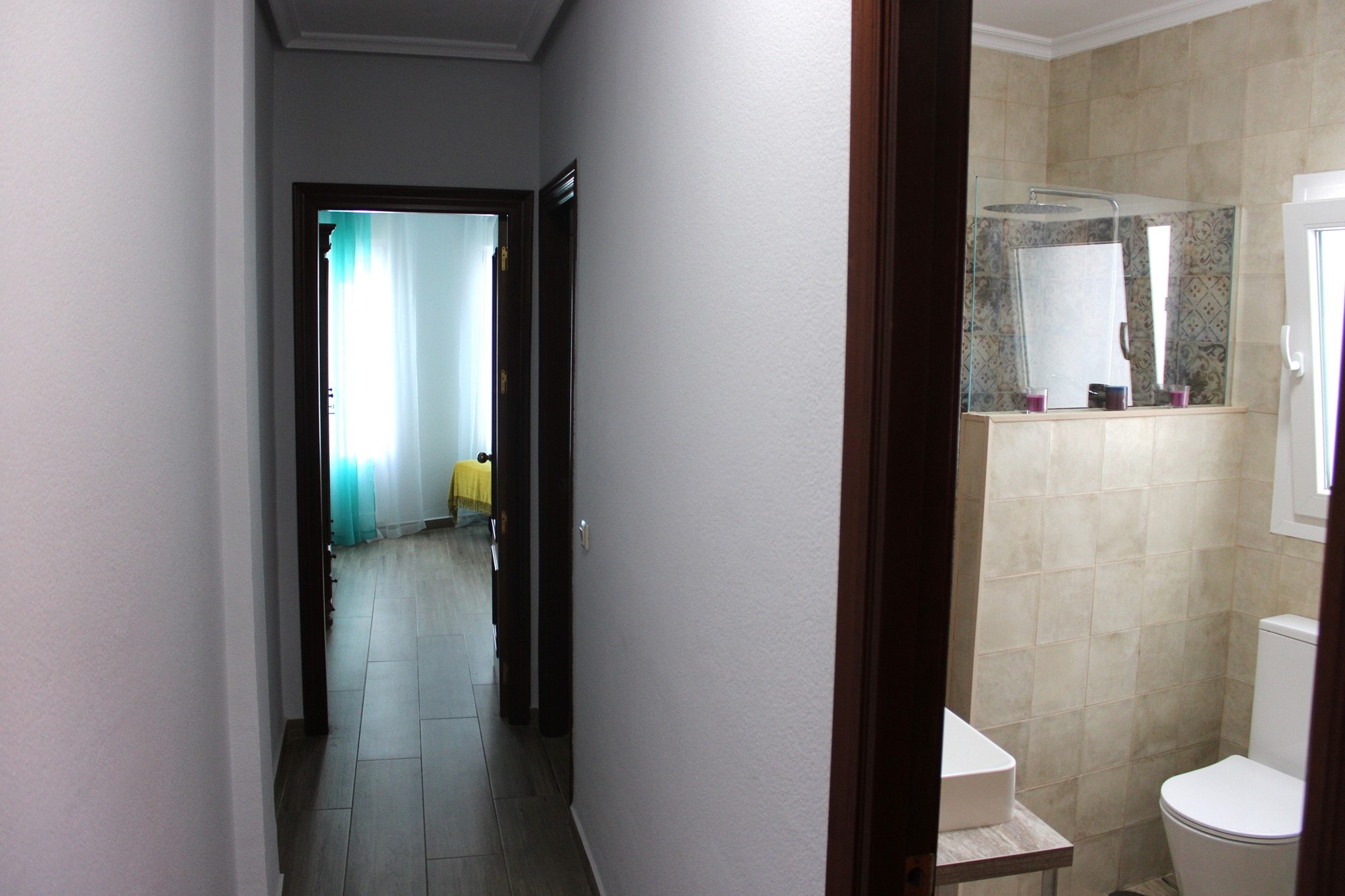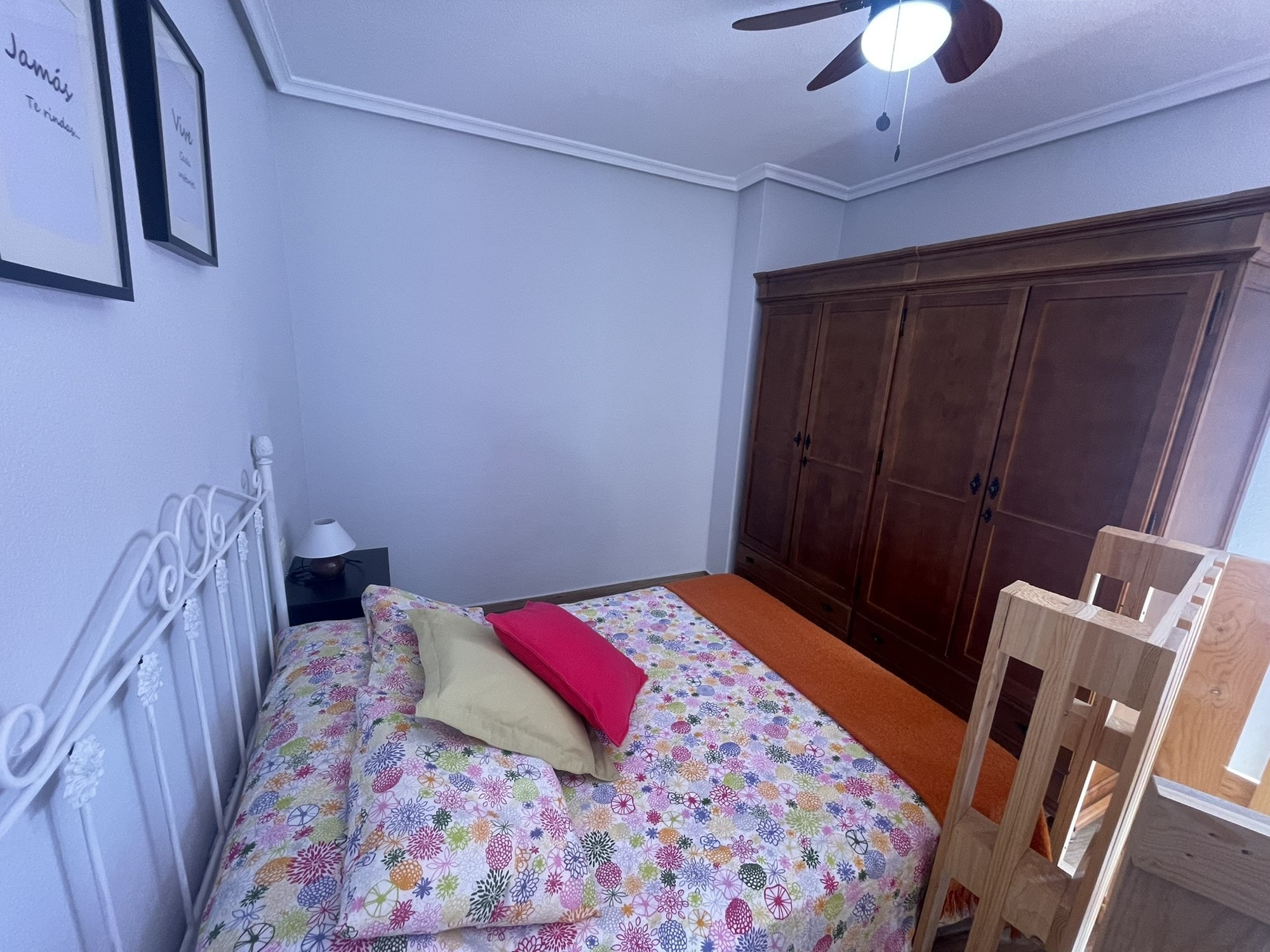 The lounge is bright and welcoming, with a Juliet balcony that allows natural light and fresh air to pour in. Another Juliet balcony can be found in one of the bedrooms, enhancing the charm and character of the home. Every window is fitted with mosquito nets and manual blinds, ensuring comfort throughout the year.