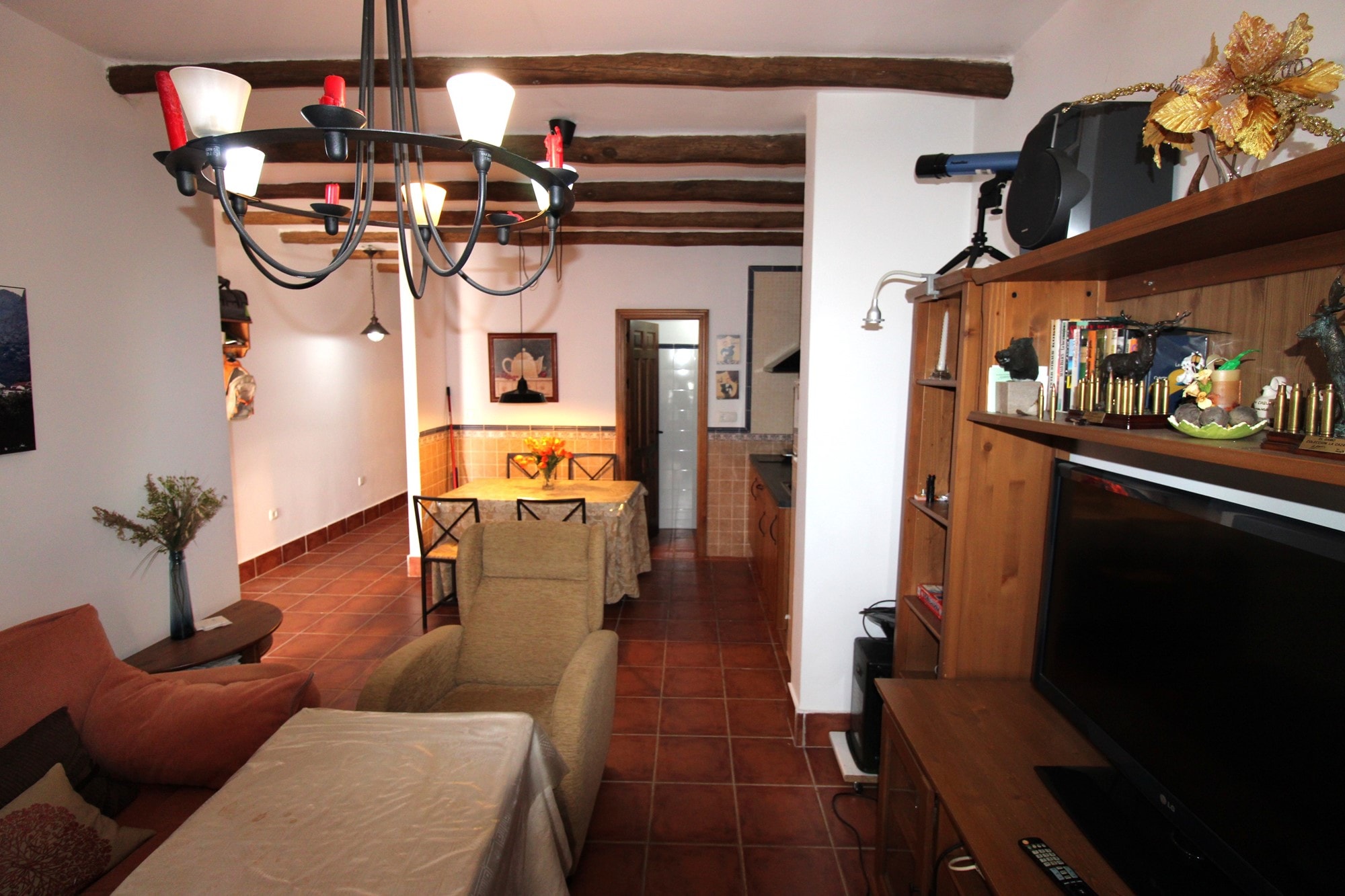 Inside, the apartment welcomes you with rich wooden ceiling beams that run throughout, adding a warm, traditional Andalusian feel. The open-plan living area flows effortlessly from the lounge to the kitchen and dining space, creating a sociable and light-filled environment. A separate pantry off the kitchen houses the electric water boiler and offers useful extra storage.